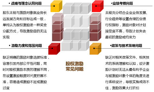 佐佑研究表明,由于股權激勵對企業(yè)內部管理基礎、人員理念與組織文化匹配性、戰(zhàn)略方向和目標清晰性等要求較高,企業(yè)在實施股權激勵時仍然存在一些共性問題,主要表現(xiàn)在: