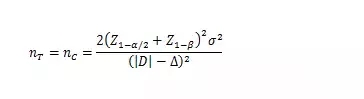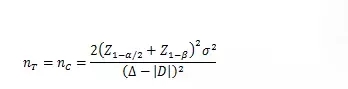 以下公式中,nT、nC分別為試驗組和對照組的樣本量;Z1-α/2、Z1-β為標準正態(tài)分布的分數(shù)位,當α=0.05時,Z1-α/2=1.96,當β=0.2時,Z1-β=0.842;(Z1-α/2+Z1-β)2=7.85